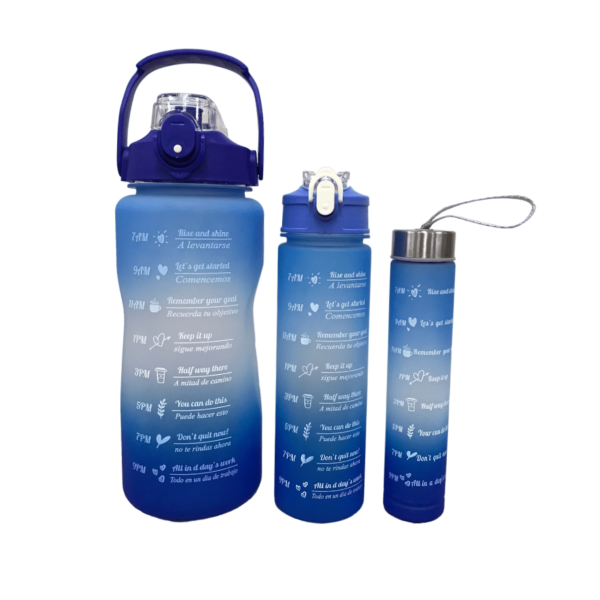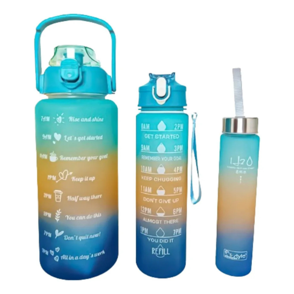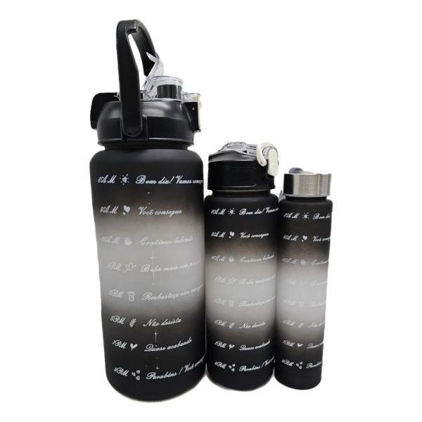 Cada garrafa inclui um tamanho próprio com 2000 ml, 900 ml e 300 ml! Com tampas que fecham facilmente e contam com o sistema vedar corretamente e não vazar o líquido, já embutidos na garrafa e outra de rosquear.