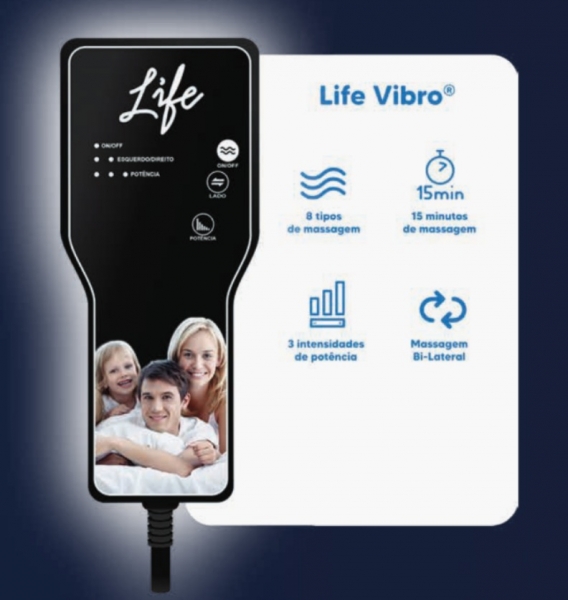 Desfrute do conforto e durabilidade desse colchão para uma qualidade de sono incomparável. Colchão com massagem, Controle Life Vibro, motores de 4500 rpm, 15 minutos de massagem, 3 intensidades de potência, pastilhas de infravermelho longo e pastilhas magnéticas.