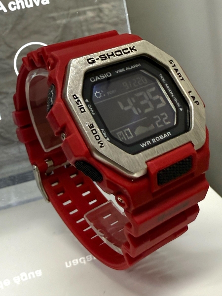 Design robusto, estilo “tático / esportivo / urbano”, com cor vermelha predominante no corpo e pulseira