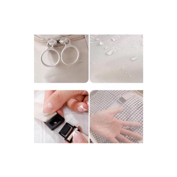 - Higiene e praticidade: bolsa para sapatos e saco para roupas sujas separam itens limpos de usados; telas permitem ventilação e visualização imediata.
